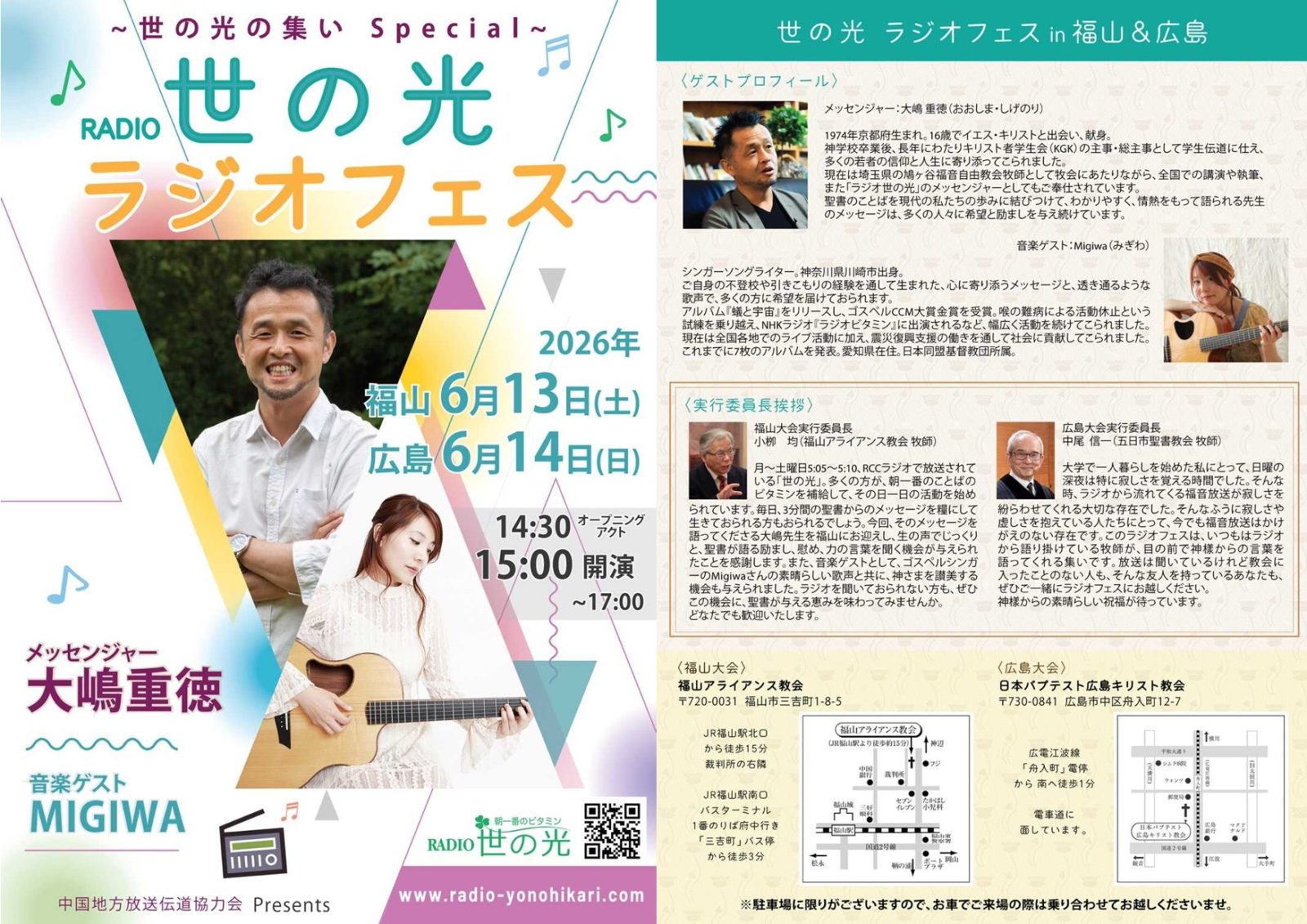2026年6月13・14日 世の光ラジオフェス@福山、@広島ラジオ牧師による熱いメッセージと音楽ゲストのすばらしい歌声をお届けします。世の光リスナーの皆さまはもとより、どなたでも歓迎いたします。ぜひご予定ください!